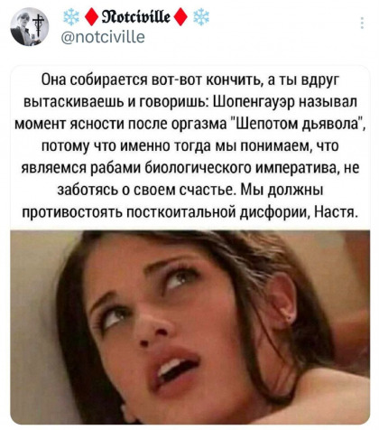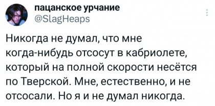 «В общем, ты такая, в шляпе и вьетнамках, приходиш ко мне, с чимаданом. И говориш: «Здрасьте, это вы квартиру сдаёте?» Я тебе отвечу: «Ну я, хуле… Заходи» Ты заходиш, показываеш мне песду, и я тебя ебу на чимадане, закрыв тебе ебло шляпой. Гыгыгы!»