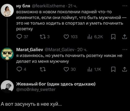 «И бабе этой на голову начинаю блевать. Колбаской там блюю нарезной, огурчиками. Супом же еще блюю. Днем супа вкусного сожрал. Обидно, блять, до сих пор - такой суп нажористый пропал.»