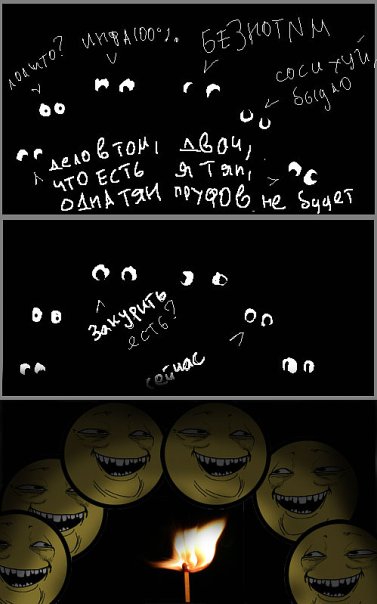 «Челюсть щелкает пружиной. Антоха от неожиданности наваливается на живот Егорычу. Химические процессы внутри организма и неожиданное давление извне подымают тело в положение сидя. Руки папы обнимают Валеру. Вдова истошно орет. Антоша тихонько обссыкается. Валера с перепугу хуярит батю пассатижами в лоб. Такой подляны папа не ожидал и обиженно укладывается на место. »
