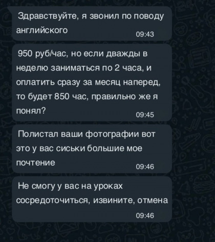 «Хочу, чтобы она педикюр никогда не делала, и ногти на ковер грызла. И только тогда, когда я обедаю. А еще никогда за собой не смывала унитаз. Прокладки использованные прямо в свое гавно кидала и никогда, запишите, никогда не смывала. Чтобы в раковину мочилась, как в биде, ногу по-собачьи задирала и фонтанировала, брызгаясь на зубные щетки. Запишите, это важно.»