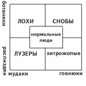 Теперь мы подходим к важной части - мы можем построить область, заключающую в границах прямоугольника всех людей (см. рис. 1). Причем координаты каждого человека будут зависеть от того, насколько он мудак или говнюк, склонен к ботанизму или распиздяйству. На диаграмме обозначены пять типов таких людей, которые условно названы: лузеры, лохи, снобы, хитрожопые и нормальные.